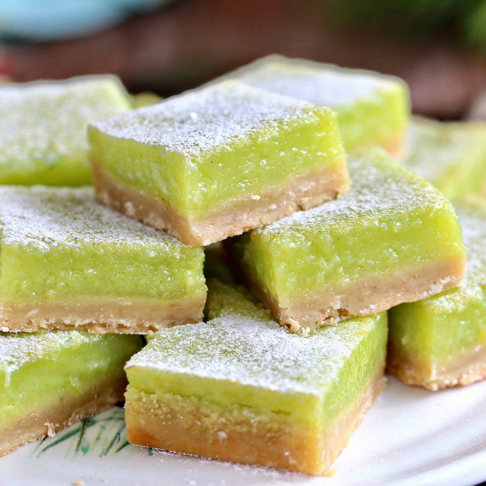 Key Lime Bars: Homemade vanilla shortbread crust, layer of key lime filling, sprinkled with powder sugar.