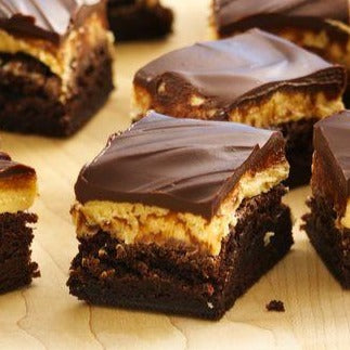 Peanut Butter Truffle Brownies: Brownie base, layer of peanut butter filling, topped with chocolate ganache.