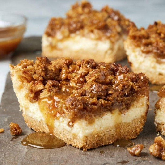 Praline Crumb Caramel Cheesecake Bars: Homemade sugar cookie crust with pecans, layer of vanilla cheesecake, topped with caramel and toffee bits.