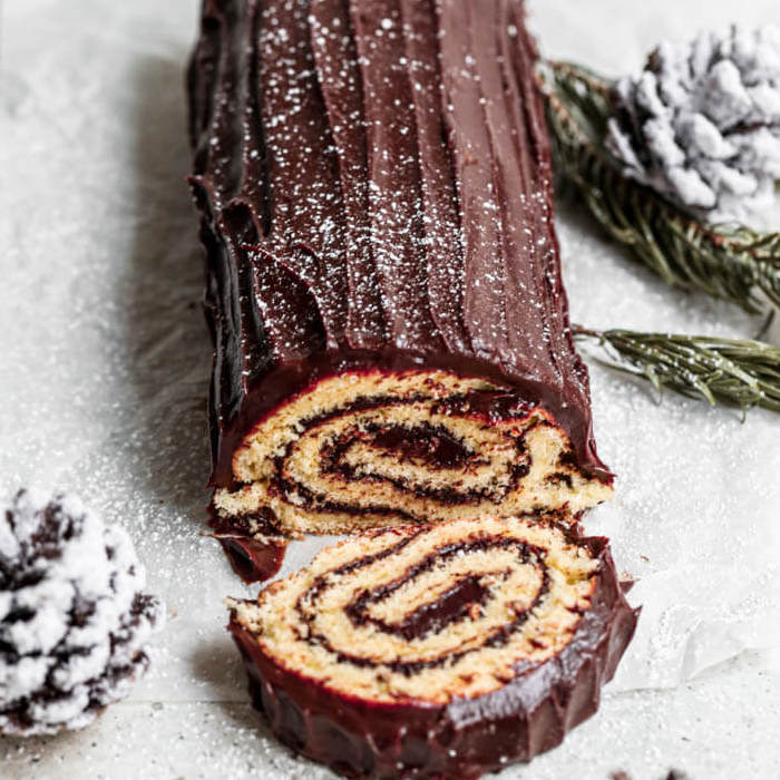 Bûche de Noël (Yule log) is a traditional French dessert served at Christmas time. It is a vanilla roll cake filled and covered with chocolate dulce de leche ganache. The outside is finished to resemble wintery tree bark. Simply exquisite!
