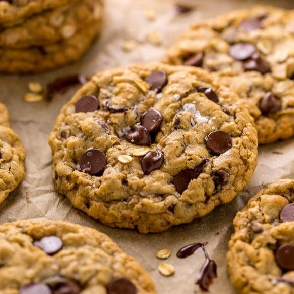 Dark Chocolate Chip Oatmeal Cookies: (my husband’s favorite!) Made with dark chocolate chips, old-fashioned rolled oats, and molasses. Drizzled with butterscotch topping.