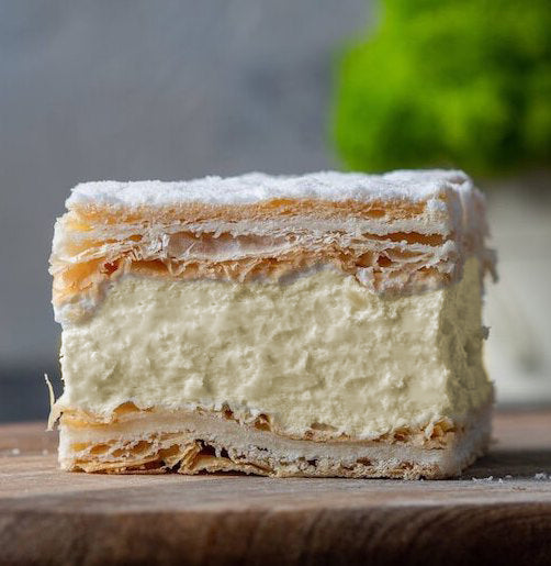 This delight is made with crème patisserie (vanilla custard cream) sandwiched between two layers of puff pastry, and then it is lightly dusted with powdered sugar. Delicious and elegant, best served cold.