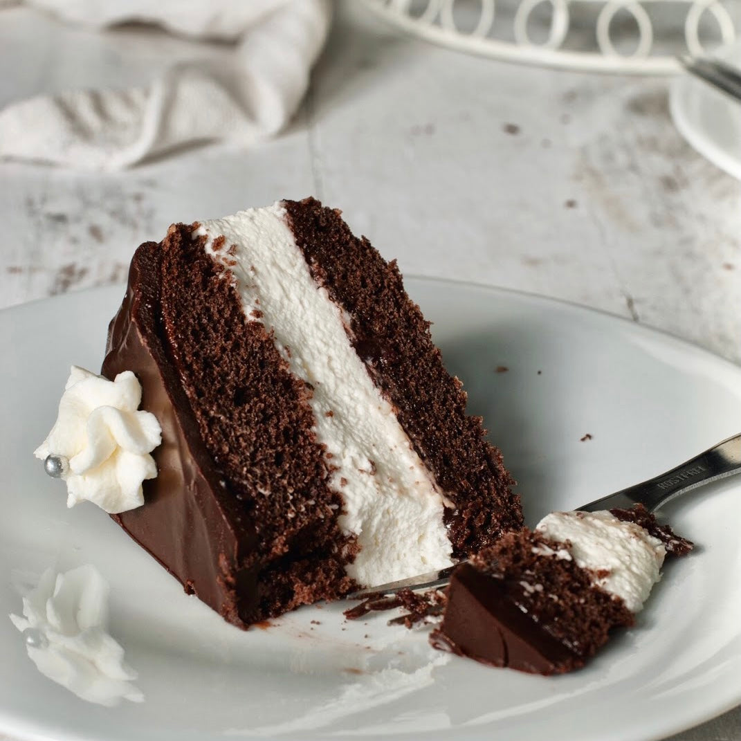 Moist and light chocolate sponge cake, filled with vanilla whipping cream, topped with chocolate ganache. This 4-layer cake is delicious and elegantly stunning!