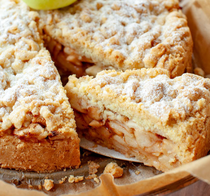 Traditional Polish apple cake is a favorite dessert served in Poland. The bottom crust is a cross between a dense cake and shortbread. It is lightly sweetened, allowing the apples’ warm flavors to shine. The apple filling consists of fresh apples, sugar, and szarlotka spice (cinnamon, cloves, nutmeg, cardamom, ginger). The top crust is a duplication of the same dough as the bottom crust, and it is crumbled over top of the cake. To finish, it is dusted with powdered sugar. In traditional Polish custom, the cake is served cold or warm with a scoop of vanilla ice cream. Many enjoy it with coffee or tea as well. *A vegan version is offered as well